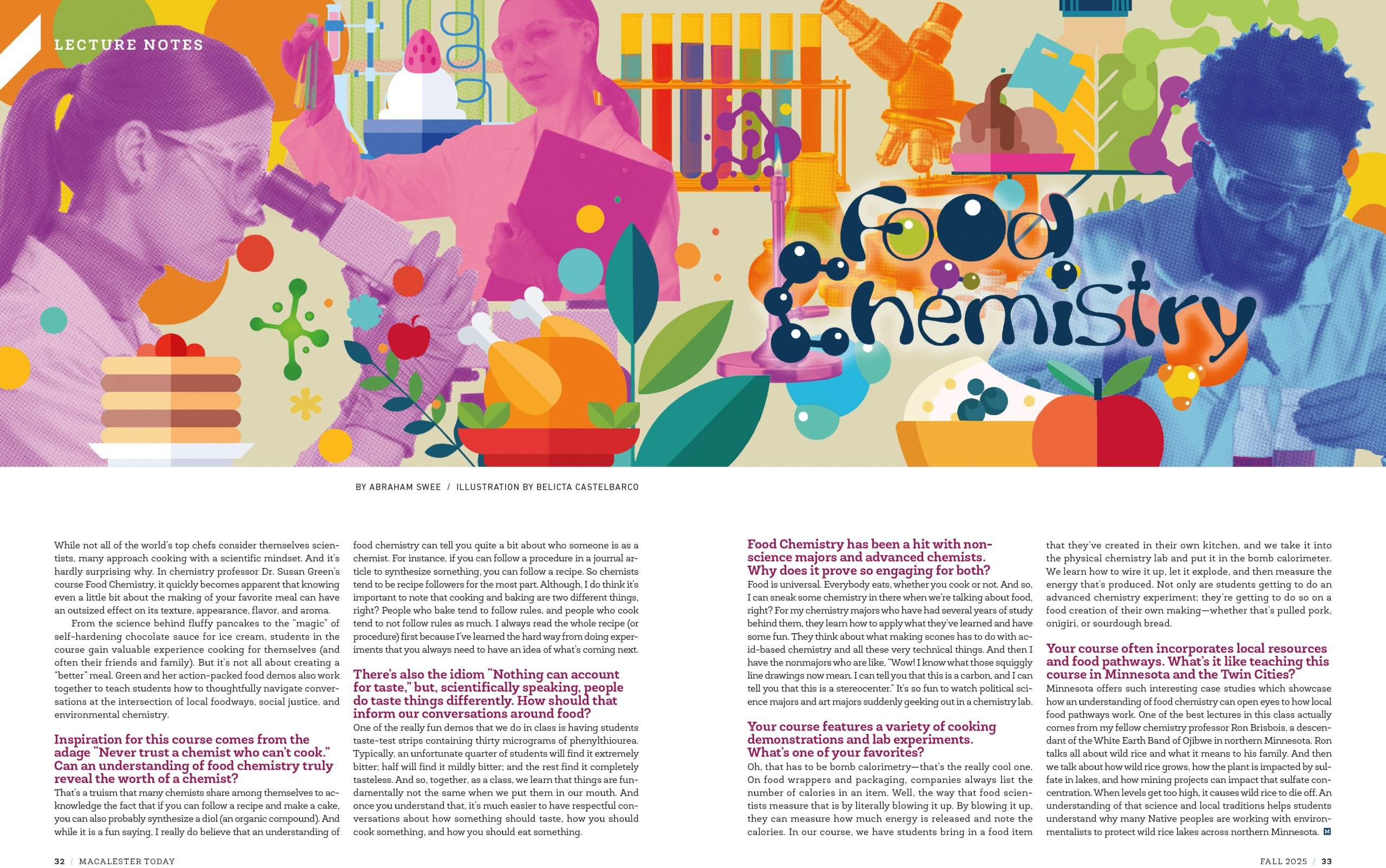 Belicta was commissioned to create an illustration, “Lectures Notes- Food Chemistry” for Macalester Today Fall 2025, by Abraham Swee, the flagship publication of Macalester College.