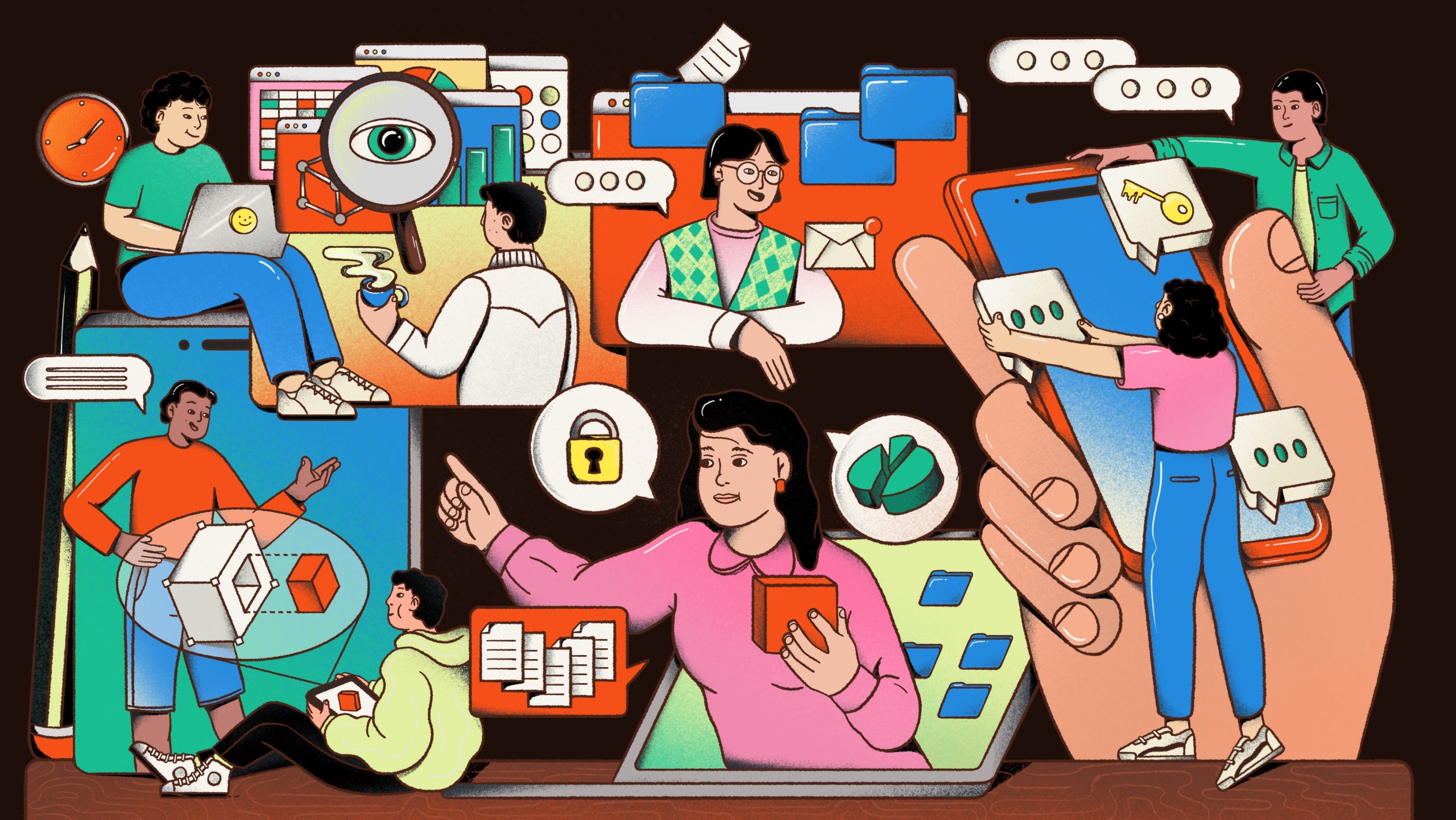 Esteban focused on depicting a meeting in a digital environment where a leader raises questions and challenges while participants actively engage in discussions, with AI present behind each person—processing data and helping solve those challenges simultaneously.