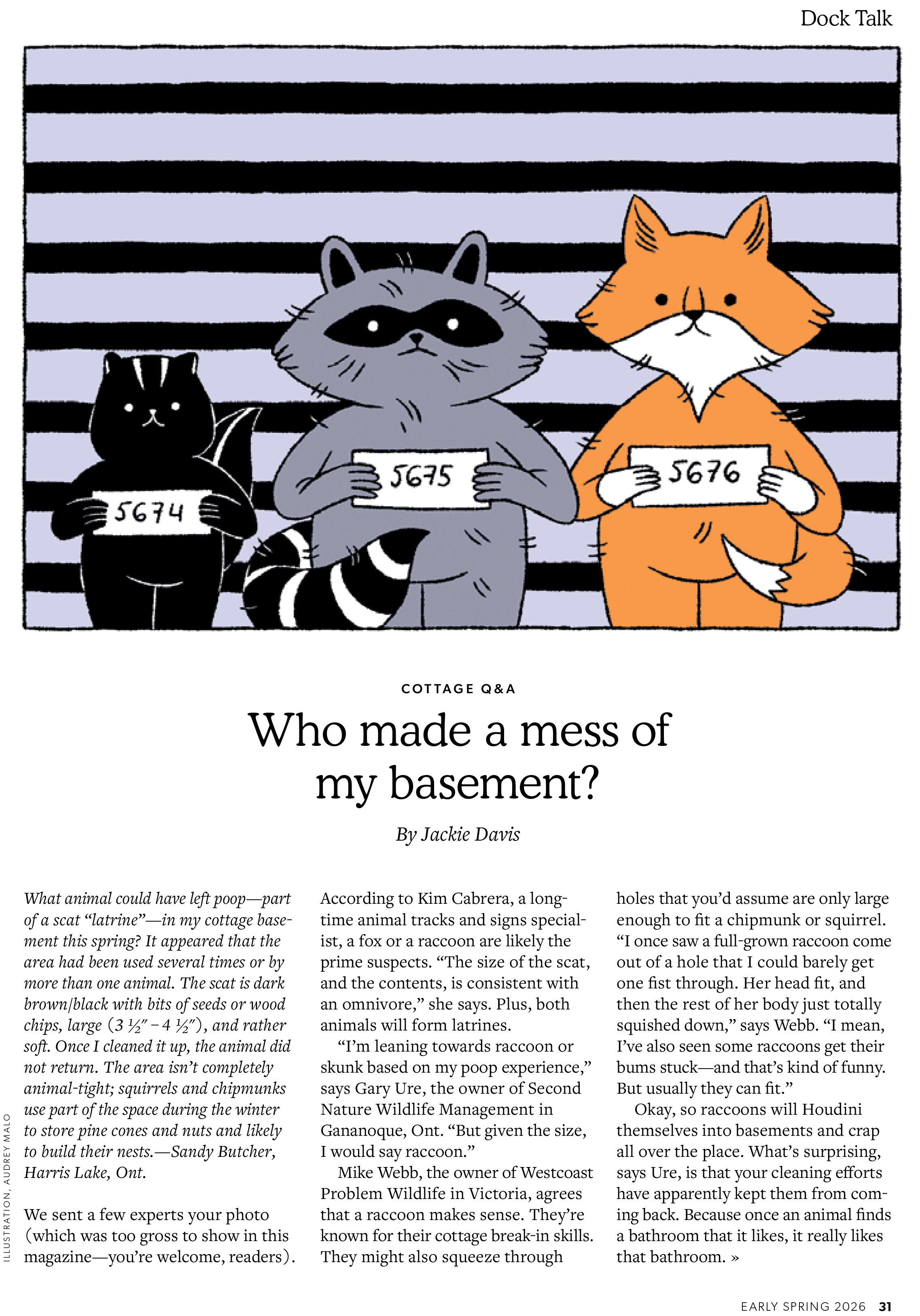 Audrey Malo a été mandatée par Cottage Life pour illustrer la rubrique Questions-Réponses en début de leur dernier numéro. On y trouve des réponses aux questions des lecteurs sur la vie au chalet, comme par exemple comment identifier l’animal responsable du désordre dans un sous-sol ou comment choisir les plantations prioritaires pour un rivage naturalisé.