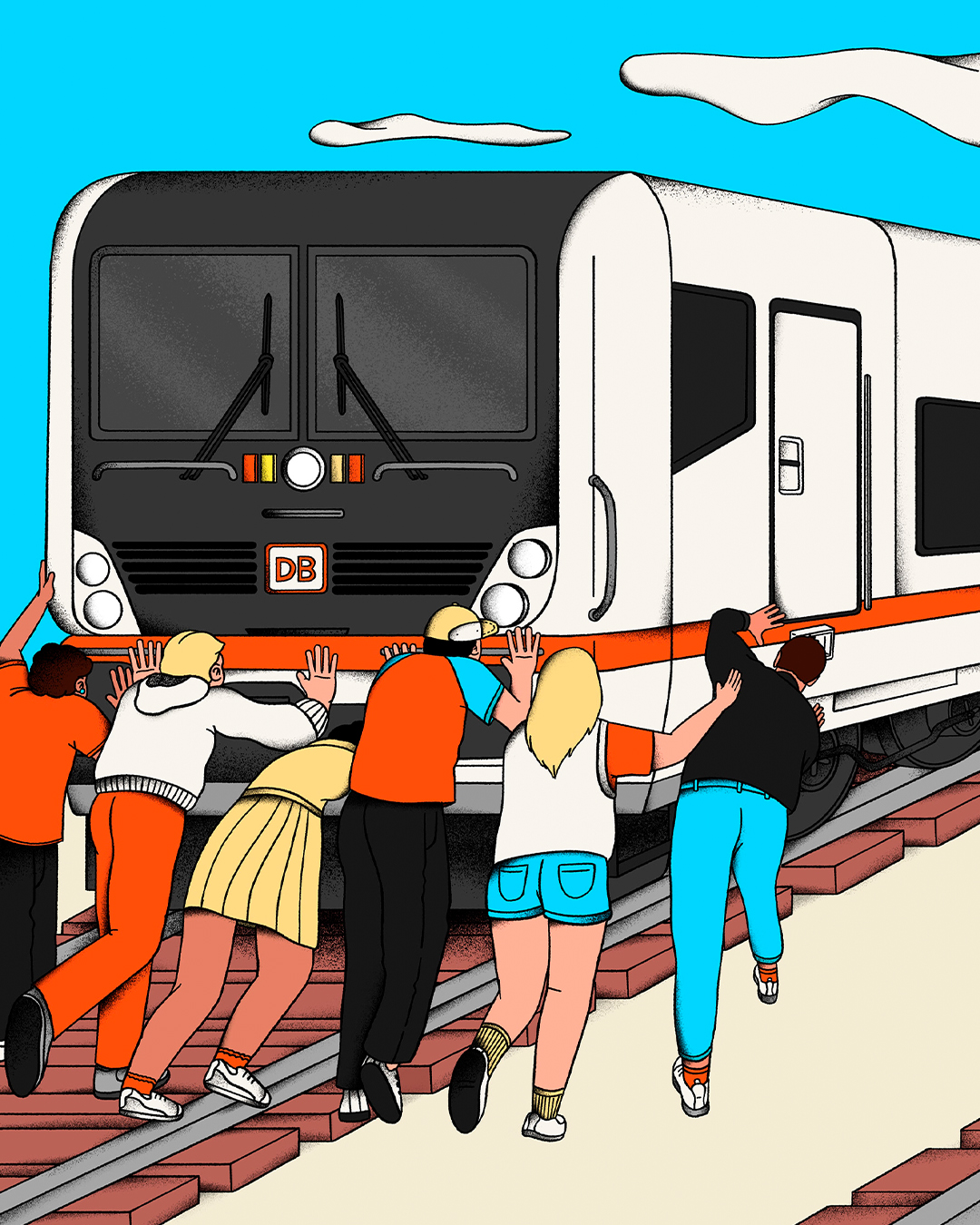 Cette illustration accompagnait l’article intitulé « Problèmes sur les rails », qui traite de la faillite de la compagnie ferroviaire allemande Deutsche Bahn, conséquence d’une mauvaise gestion politique.
