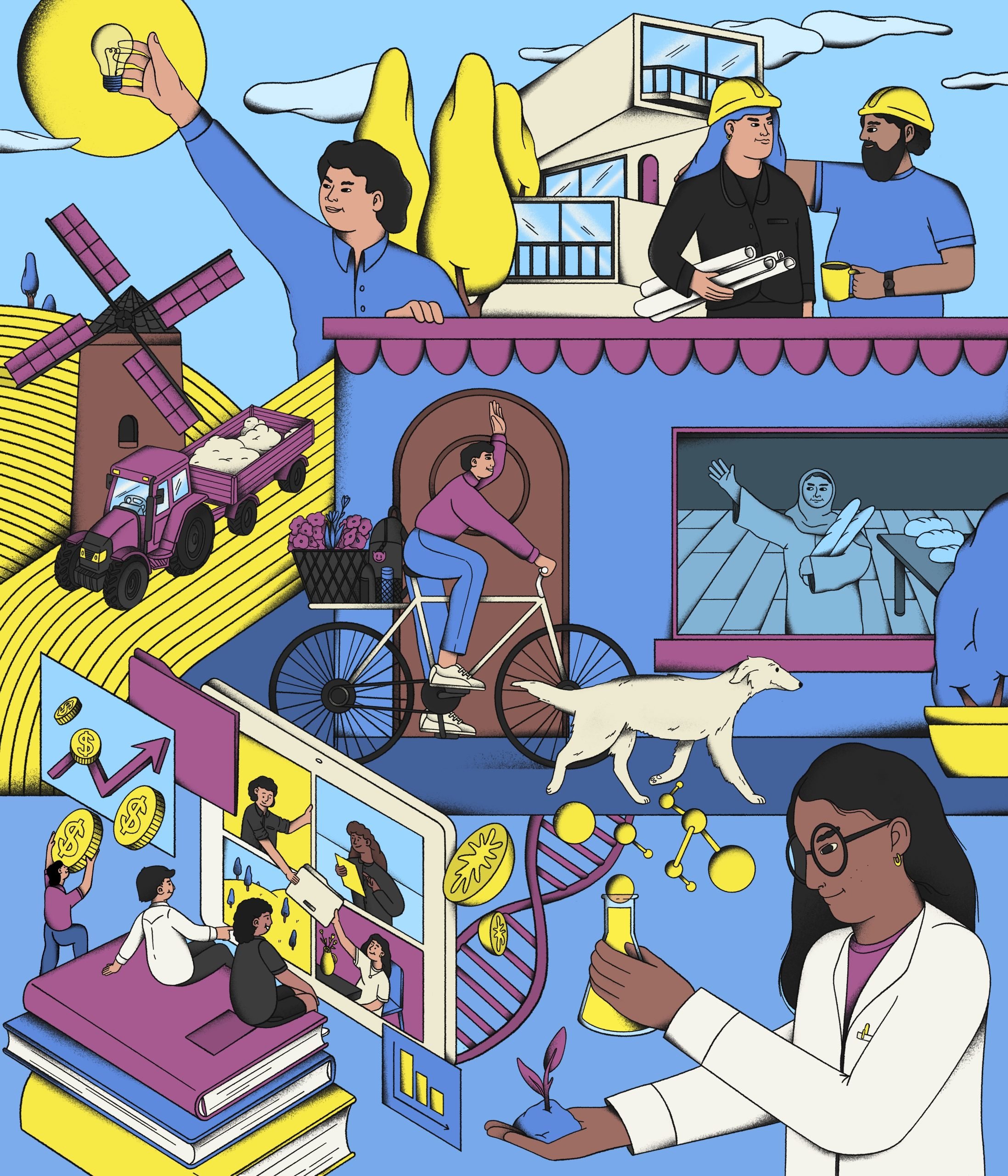Grâce à des compositions dynamiques, riches en personnages, en couleurs vives et en mouvement, il parvient à saisir l’essence de plusieurs secteurs clés mis en avant dans le magazine, tels que l’immobilier, la finance, la technologie et la médecine.