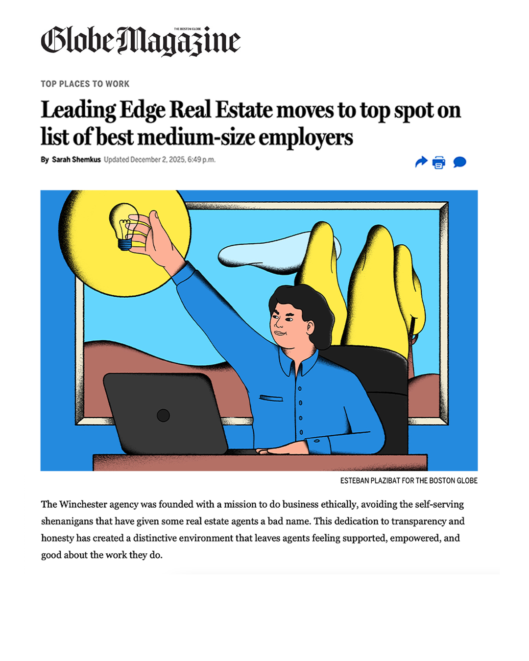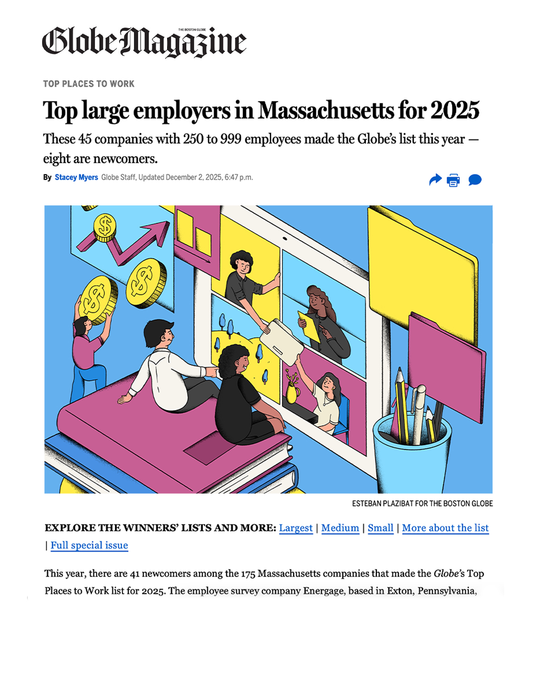 Esteban Plazibat a été chargé de réaliser l’illustration de couverture du numéro de décembre du magazine Globe. Il a non seulement illustré la couverture, mais aussi l’illustration d’ouverture du dossier principal, « Les meilleurs employeurs en 2025 », ainsi que quatre illustrations ponctuelles publiées dans les versions imprimée et numérique du site web.