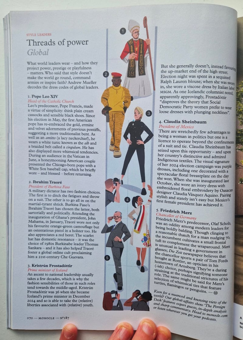 Le premier article décryptait les codes vestimentaires de dirigeants emblématiques de la scène internationale et la manière dont leurs styles sont devenus synonymes de leur identité. L’article présentait des personnalités telles que Kristrún Frostadóttir, et son look « haut de gamme » et avant-gardiste de Première ministre islandaise, ainsi que la tenue de cérémonie historique du pape Léon XIV.