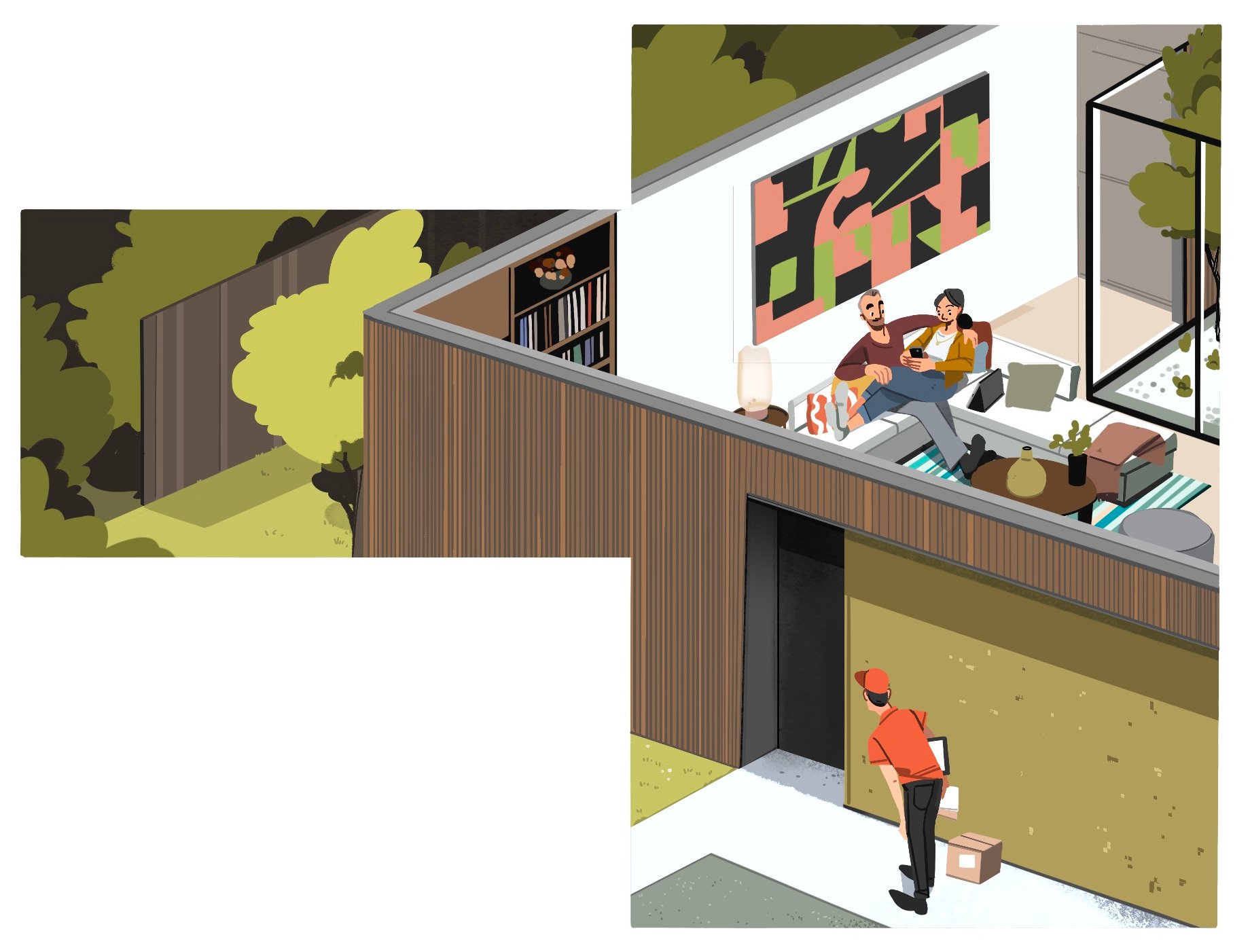Nathan s’est inspiré des plans d’architecture, de la décoration intérieure et de la conception de la maison pour représenter un couple profitant de son isolement, protégé de l’extérieur et en sécurité dans sa maison.