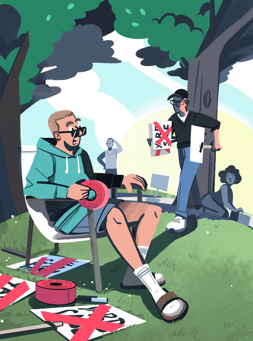 Nathan a illustré une double page d’ouverture qui pose les thèmes et le ton de l’histoire, avec comme élément déclencheur la chute à travers le plafond. Deux illustrations ponctuelles reflètent le désespoir et le sentiment d’impuissance de l’auteur, ainsi que la détermination d’un personnage face à la brute du quartier. La difficulté du projet résidait dans l’équilibre entre tragédie et humour, et Nathan y est parvenu grâce à la mise en scène et à la narration des illustrations, ainsi qu’à des palettes de couleurs qui ont allégé le thème et reflété au mieux la personnalité de l’auteur.