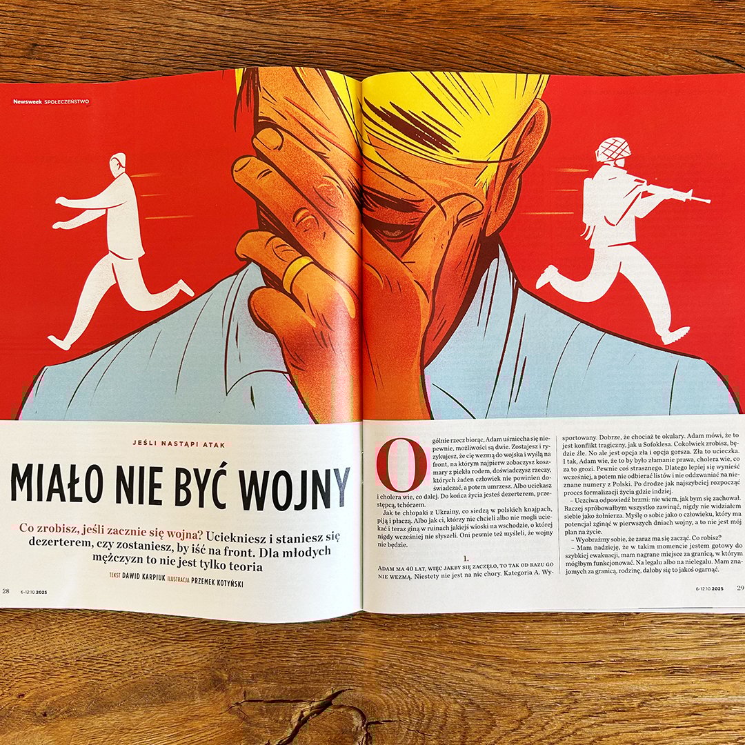 Kotynski was commissioned to illustrate the growing fear of war among Poles. What to do when the peace breaks. Stay or go?