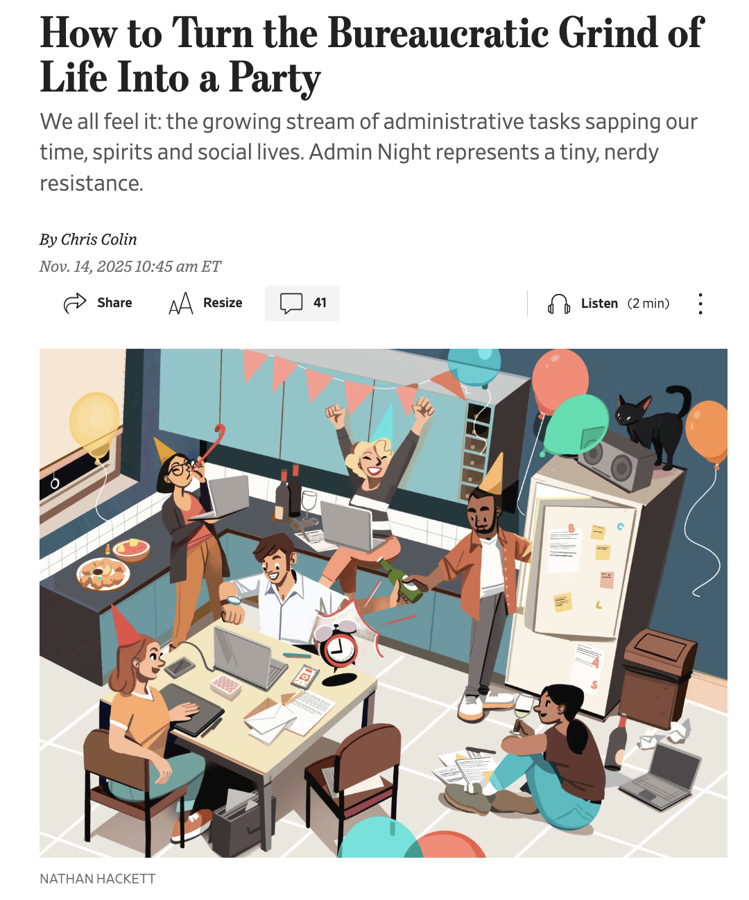 Nathan was asked by the Wall Street Journal to illustrate for an article written by Chris Colin about his novel idea of turning the isolated fatigue of admin in life into a social night.